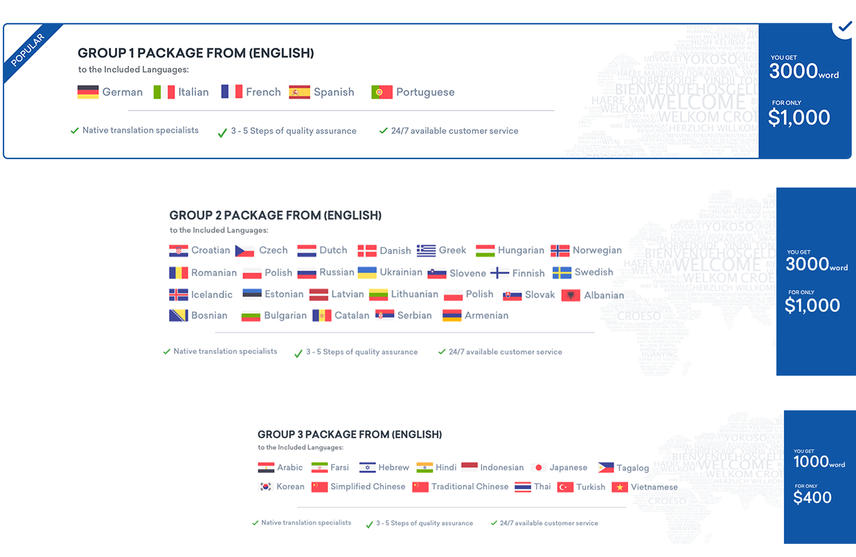 Our pack is a combination of your needed language pairs and the word count you may consume, we have created for you some packages with the most popular language pairs and a reasonable word count.